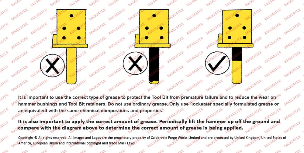 The type of grease utilized is extremely important. Do not use regular grease. Only use ROCKEATER HAMMER GREASE NLGI No 2 or a suitable equivalent from the list below. ROCKEATER does not partake in any brand endorsement nor claims or implies that any particular brand maybe superior to another.